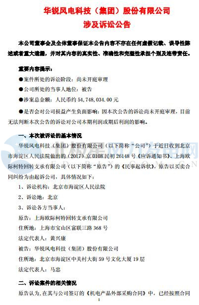 華銳風(fēng)電再陷訴訟官司!涉案金額達5474.80萬元