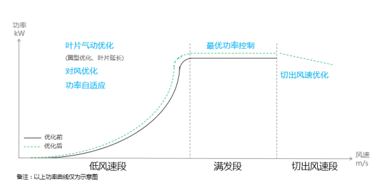 功率曲線全周期最優(yōu),挖掘最大發(fā)電潛能。圖為金風(fēng)風(fēng)電場(chǎng)發(fā)電量提升解決方案及其在功率曲線的不同階段對(duì)發(fā)電量的影響