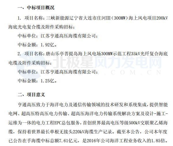 亨通中標(biāo)2個海上風(fēng)電項目 總金額達(dá)3.17億元