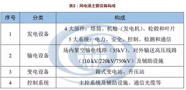 風(fēng)電場主要由發(fā)、輸、變、控四大設(shè)備系統(tǒng)構(gòu)成。發(fā)電設(shè)備即風(fēng)力發(fā)電機(jī)組,包含電能進(jìn)入風(fēng)力發(fā)電機(jī)組塔基箱變之前的所有設(shè)備;輸電設(shè)備是將所發(fā)電力對(duì)外輸送的線路,包括高壓線、桿塔及輔助設(shè)施;變電設(shè)備是將所發(fā)的低壓電力變?yōu)楦邏弘娏?duì)外輸送,風(fēng)電場中一般包含箱式變電站和風(fēng)電場升壓站(兩次升壓);控制系統(tǒng)是為保障以上相關(guān)設(shè)備的正常運(yùn)行進(jìn)行控制和管理。