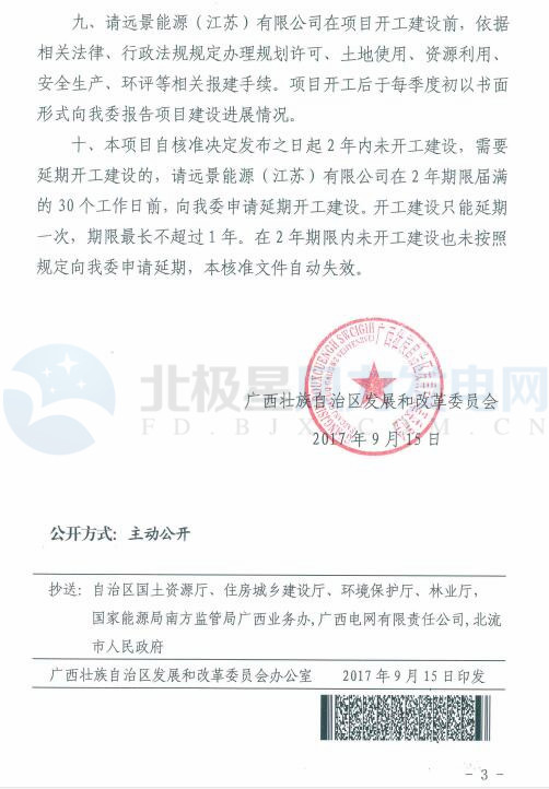 近日廣西壯族自治區(qū)發(fā)展和改革委員會(huì)批復(fù)核準(zhǔn)北流清灣風(fēng)電場(chǎng)工程,該項(xiàng)目單位為遠(yuǎn)景能源(江蘇)有限公司,建設(shè)地點(diǎn)位于北流市平政鎮(zhèn)、六麻鎮(zhèn)、石窩鎮(zhèn)等一帶山地,建設(shè)容量為37.4MW,總投資34015萬元。以下為批復(fù)原文: