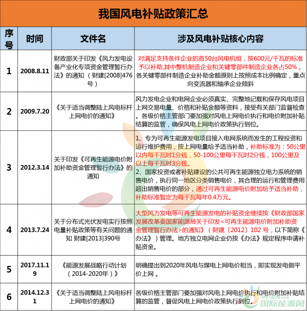 國(guó)家政策對(duì)風(fēng)電的支持是促進(jìn)風(fēng)電取得如今成就的重要條件。風(fēng)哥梳理了近年來關(guān)于風(fēng)電補(bǔ)貼的一些政策,如下表所示: