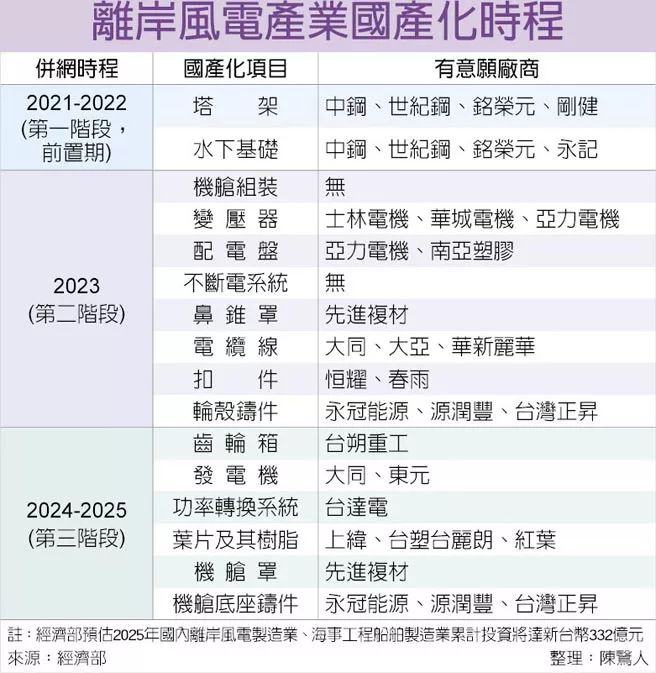 經(jīng)濟部昨(15)日公告離岸風(fēng)電遴選辦法,最受外界關(guān)注離岸風(fēng)電國產(chǎn)化將分3階段進行,經(jīng)濟部預(yù)估,至2025年本土產(chǎn)業(yè)鏈累積投資額上看332億元