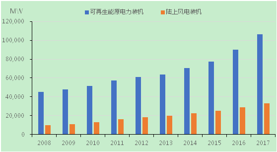 2008-2017年印度可再生能源電力與陸上風電裝機