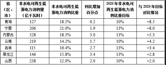 寧夏。2017年,全部可再生能源電力消納量有較大幅度提高,達(dá)到225億千瓦時(shí),占本省全社會(huì)用電量的比重為23.0%,同比上升1.9個(gè)百分點(diǎn);非水電可再生能源電力消納量為206億千瓦時(shí),占本省全社會(huì)用電量的比重為21.0%,同比上升1.9個(gè)百分點(diǎn)。風(fēng)電和光伏發(fā)電均未達(dá)到最低保障收購年利用小時(shí)數(shù)要求,偏差分別為-200小時(shí)和-174小時(shí)。