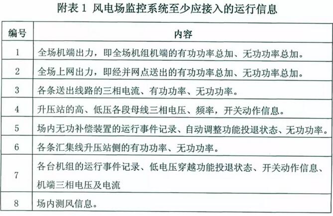 13、風(fēng)電場(chǎng)應(yīng)配置風(fēng)電場(chǎng)重監(jiān)控系統(tǒng)..實(shí)現(xiàn)在線動(dòng)態(tài)調(diào)節(jié)全場(chǎng)運(yùn)行機(jī)組的有功/無(wú)功功率和場(chǎng)內(nèi)無(wú)功補(bǔ)償裝置的投入容量,并具備接受電網(wǎng)調(diào)度部遠(yuǎn)程自動(dòng)控制的功能。風(fēng)電場(chǎng)監(jiān)控系統(tǒng)應(yīng)按相關(guān)技術(shù)標(biāo)準(zhǔn)要求,采集、記錄、保存升壓站設(shè)備和全部機(jī)組的相關(guān)運(yùn)行信息(詳見表1),并向電網(wǎng)調(diào)度部門上傳保障電網(wǎng)安全穩(wěn)定運(yùn)行所需的運(yùn)行信息。