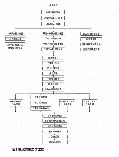 纜機(jī)軌道安裝。錨固件埋設(shè)。輔助吊裝設(shè)施架設(shè)→A字塔架拼裝→主索過江→配重車安裝→后拉索安裝→A字塔架提升、自升斗小車安裝→牽引、提升索安裝,系統(tǒng)調(diào)試→試運(yùn)行。