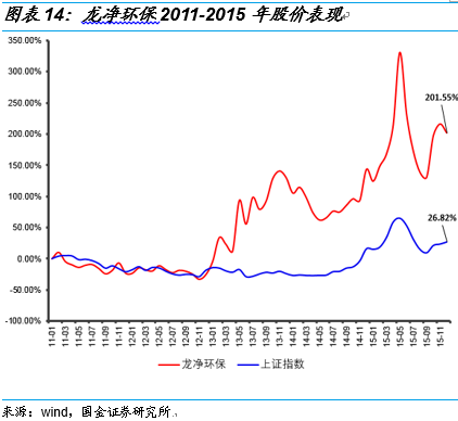龍凈環(huán)保依靠其SCR煙氣脫硝技術(shù)將圓盤回旋混流技術(shù)與AIG氨噴射技術(shù)進行有機結(jié)合,可保證氨/煙氣混合更加均勻;氨氣流量調(diào)節(jié)采用氣動薄膜單座直通式調(diào)節(jié)閥組來實現(xiàn),具有線性調(diào)節(jié)性好、反應(yīng)動作快、調(diào)節(jié)穩(wěn)定、密封性能好等優(yōu)點,既可保證高脫硝率,又能準確控制氨流量,保證氨逃逸率。采用該先進技術(shù),可保證脫硝率達90%以上,氨逃逸<2.5ppm,SO2/SO3轉(zhuǎn)化率<1%。在2015年中電聯(lián)公布的簽訂合同的火電廠煙氣脫硝機組容量情況中,龍凈環(huán)保排名全國第二。隨著脫硝市場的快速釋放和業(yè)績的增加,公司股價從2011年初到2015年底上漲201.55%,跑贏上證指數(shù)175個百分點,公司市值也由2011年初的71.5億增加至2015年底的185億。