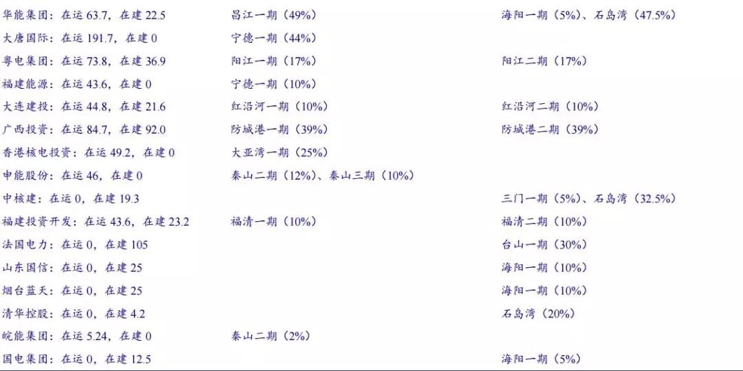 各大發(fā)電集團積極布局。除了三家具有控股資質(zhì)的核電巨頭外,華能、大唐、國電、華電也分別參股了數(shù)個已投運及在建的核電項目。福能、浙能、申能、粵電等地方能源集團在本省的核電項目中擁有一定股權(quán)。