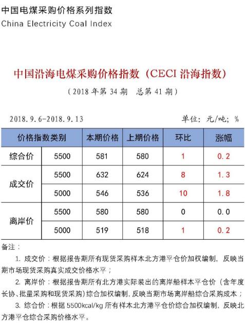 今日,中電聯(lián)公布中國(guó)沿海電煤采購(gòu)價(jià)格指數(shù)(CECI沿海指數(shù))第41期數(shù)據(jù):