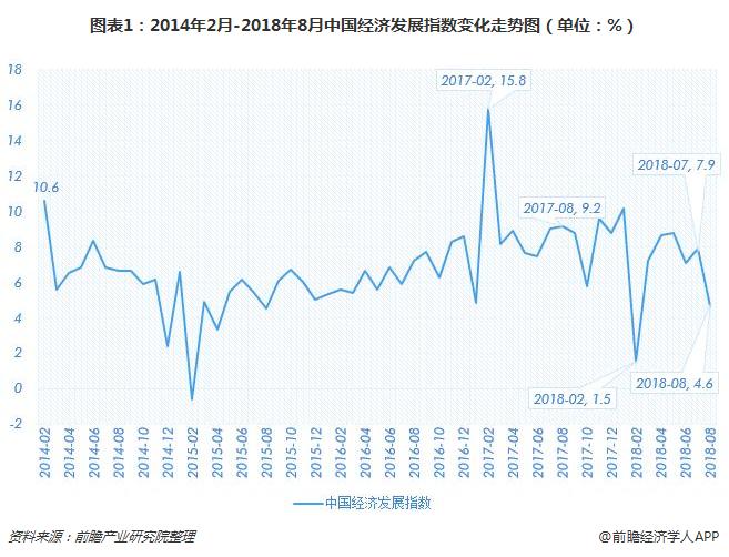 長期監(jiān)測數(shù)據(jù)顯示,2018年8月中國經(jīng)濟(jì)發(fā)展指數(shù)為4.6%,環(huán)比滑落3.3個(gè)百分點(diǎn)(2018年7月為7.9%),同比下滑4.6個(gè)百分點(diǎn)(2017年8月為9.2%)。