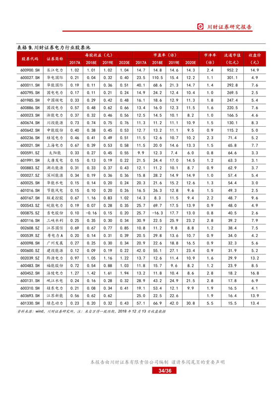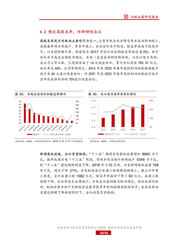 在政策和市場化助力下, 2018 年棄水情況繼續(xù)緩解, 可再生能源電力配額及考核辦法正式開始執(zhí)行后,水電企業(yè)還將受益。 穩(wěn)定的高分紅率使得水電防御特性出眾,隨著水電建設(shè)的放緩, 一方面資源稀缺性逐漸顯現(xiàn), 另外一方面資本開支的下降將有效保證分紅的延續(xù)性。優(yōu)選兼具成長的企業(yè),相關(guān)公司為長江電力、華能水電、桂冠電力。