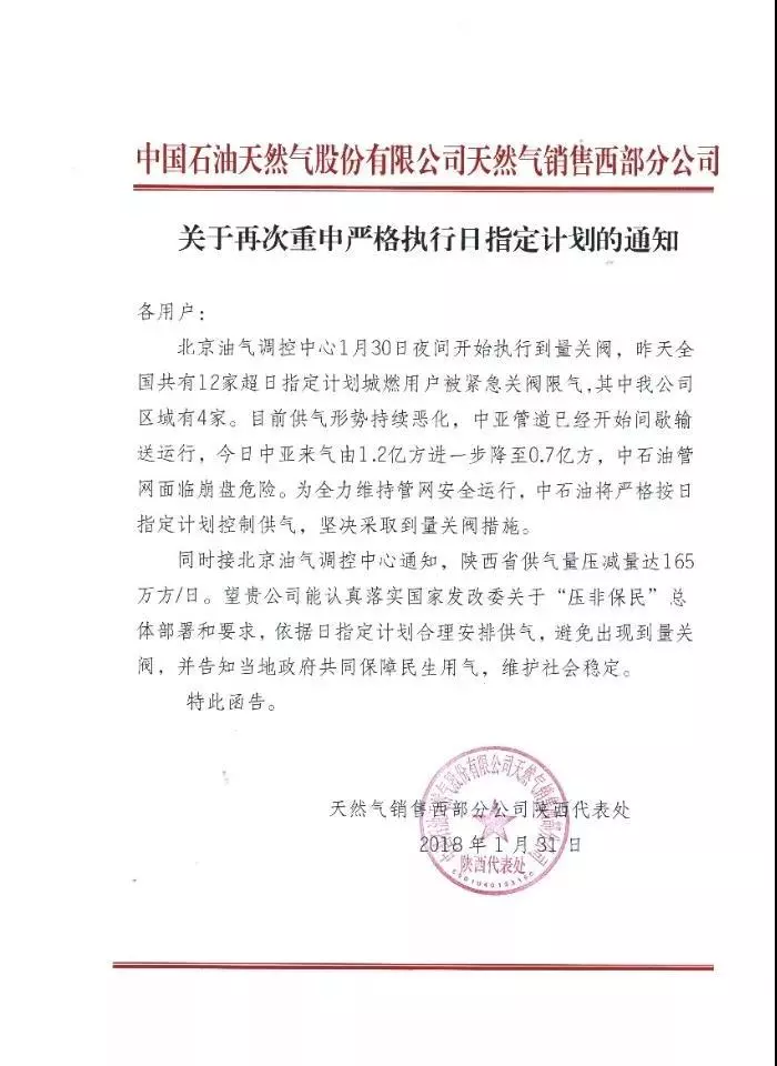 由于氣荒的出現(xiàn),銀川市區(qū)的多個加氣站停止加氣;中石油天然氣銷售公司發(fā)布嚴(yán)格執(zhí)行日指定計劃的通知,通知內(nèi)容:目前中亞來氣供應(yīng)持續(xù)不穩(wěn)定,1月份,土庫曼康采恩機組已經(jīng)停機三次,江蘇如東LNG因天氣原因無法靠岸。近期大幅降溫,中亞哈國、烏國無序下載,中亞來氣持續(xù)欠計劃2000萬方/日。日均欠量達3000萬方以上,中石油管網(wǎng)已接近臨界管存。若不控制銷售節(jié)奏,管網(wǎng)安全運行存在風(fēng)險。