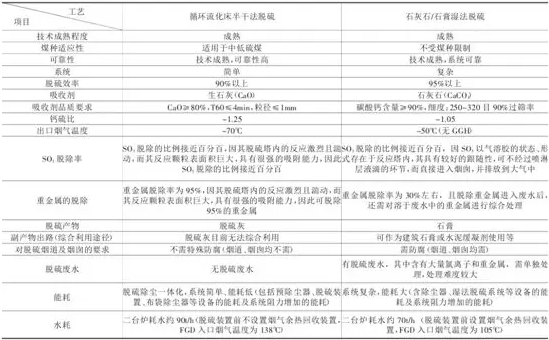 從技術(shù)上比較,本工程選用環(huán)保型CFB鍋爐,本身具有自脫硫優(yōu)勢,爐外脫硫采用半干法和濕法脫硫工藝都能滿足該工程的脫硫效率,且符合《火電廠大氣污染物排放標(biāo)準(zhǔn)》(GB13223-2011)中SO2排放濃度限值100mg/Nm3的要求,兩種方案都可采用。但循環(huán)流化床半干法脫硫工藝與石灰石/石膏濕法脫硫工藝相比,具有系統(tǒng)簡單、耗水量小、能耗低、煙囪不需防腐和無脫硫廢水、石膏排放等優(yōu)勢,同時能夠高效脫除SO3和重金屬汞等,加之本項目采用“低床溫”燃燒技術(shù)的循環(huán)流化床鍋爐,主要以爐內(nèi)脫硫為主,能大大減輕爐外脫硫壓力。