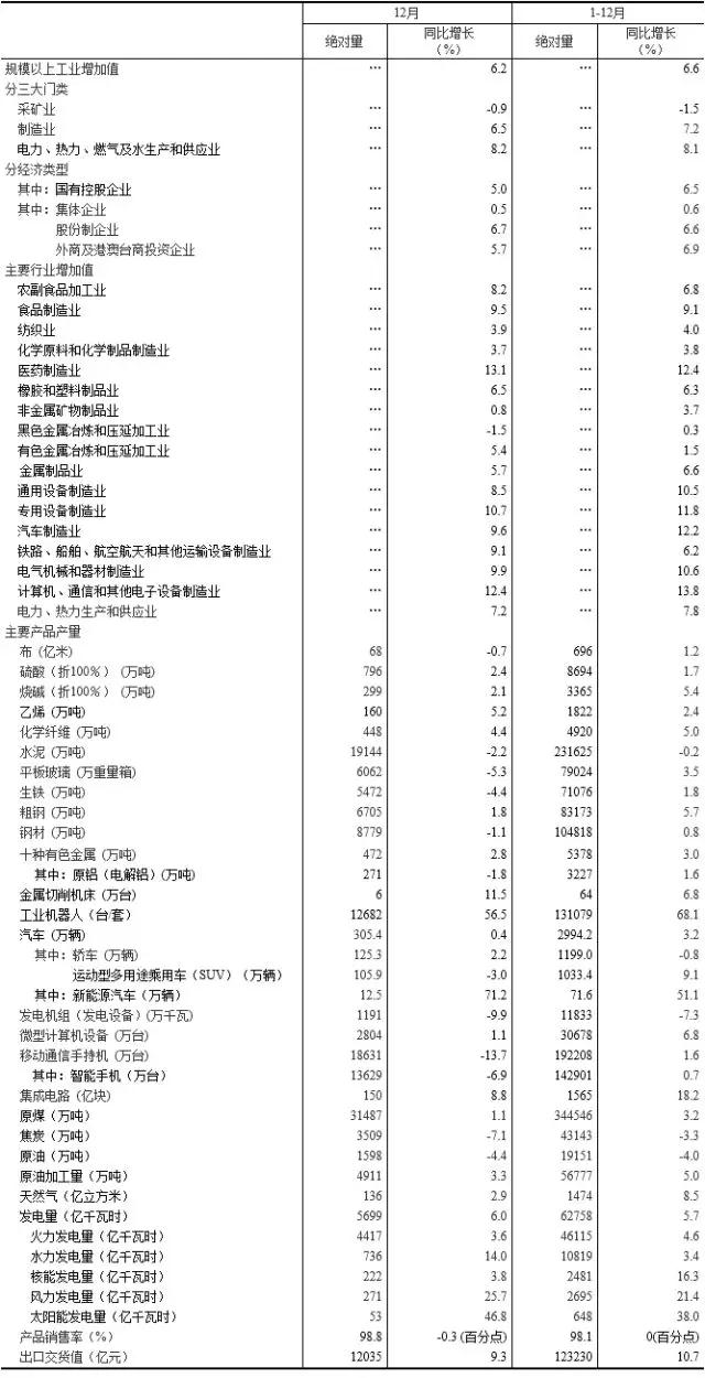 分產(chǎn)品看,12月份,596種產(chǎn)品中有331種產(chǎn)品同比增長。其中,鋼材8779萬噸,同比下降1.1%;水泥19144萬噸,下降2.2%;十種有色金屬472萬噸,增長2.8%;乙烯160萬噸,增長5.2%;汽車305.4萬輛,增長0.4%;轎車125.3萬輛,增長2.2%;發(fā)電量5699億千瓦時,增長6.0%;原油加工量4911萬噸,增長3.3%。