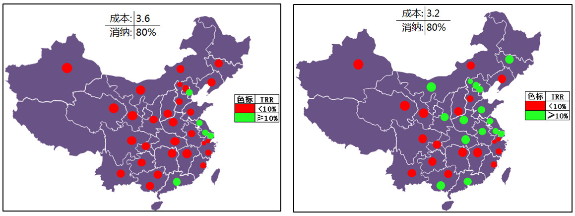投資成本為3.6元/W時(shí),滿足收益率要求的有5個(gè)城市:天津、連云港、蘇州、上海、深圳。