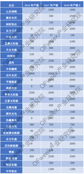 首當其沖的是目前市場反響火熱的PERC電池。2017年底單晶硅片產(chǎn)能超過44GW,2018年預計將超過60GW;多晶硅片產(chǎn)能2017年底超過90GW,預計2018年將增加到110GW,多晶比例持續(xù)下降。其中隆基2018年底單晶硅片產(chǎn)能將達到25GW,中環(huán)將達到23GW,呈現(xiàn)雙巨頭形勢。硅片下游,行業(yè)龍頭紛紛上馬高效電池片/組件擴產(chǎn)計劃,單晶電池擴產(chǎn)以單晶PERC為主。