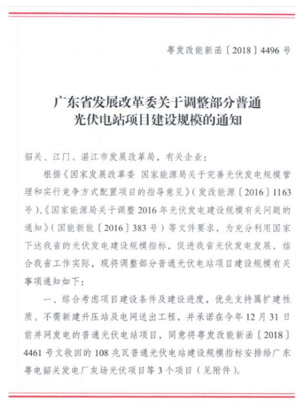 月3日,廣東省發(fā)改委下發(fā)《關(guān)于調(diào)整部分普通光伏電站項目建設(shè)規(guī)模的通知》,綜合考慮項目建設(shè)條件及建設(shè)進度,優(yōu)先支持屬擴建性質(zhì)、不需新建升壓站及電網(wǎng)送出工程,并承諾在今年12月31日前并網(wǎng)發(fā)電的普通光伏電站項目,同意將粵發(fā)改能新函【2018】4461號文件收回的108兆瓦普通光伏電站建設(shè)規(guī)模指標(biāo)安排給廣東粵電韶關(guān)發(fā)電廠灰場光伏項目等3個項目。