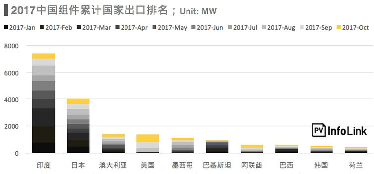 組件出口自七月以后逐月成長(zhǎng)據(jù)PVInfoLink 最新的海關(guān)出口報(bào)告顯示,十月中國(guó)組件及電池片的出口量分別為2,776MW及349MW,較九月有11%及9 5%的增加。在組件部分,下半年受到201條款效應(yīng)影響,來(lái)自美國(guó)的組件需求
