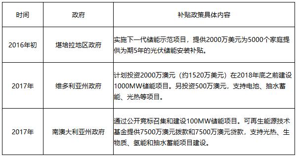 2016年9月南澳大利亞州發(fā)生大范圍停電事故,引起全國性能源安全的討論。因此抽水蓄能、電池陣列等儲(chǔ)能技術(shù)等電網(wǎng)大規(guī)模儲(chǔ)能技術(shù)成為能源領(lǐng)域的焦點(diǎn)。澳大利亞各州政府相繼推出一系列資金扶持性措施推動(dòng)儲(chǔ)能示范性項(xiàng)目的建立。