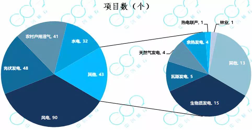 從項目類別看,已獲得減排量備案且材料公示的254個項目中,有第一類項目139個,合計備案減排量1890萬噸CO2e;第二類項目17個,備案減排量372萬噸CO2e;第三類項目98個,備案減排量3031萬噸CO2e。從項目類型看,風電、光伏、農村戶用沼氣、水電等項目較多,詳細情況如下圖所示:
