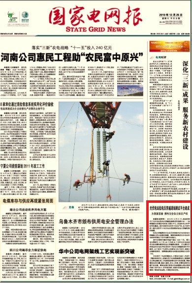 2010年12月27日,國家電網(wǎng)報(bào)頭版報(bào)道我國首套擁有完全自主知識(shí)產(chǎn)權(quán)的光伏電站低電壓穿越現(xiàn)場測試平臺(tái)在國網(wǎng)電科院建成。 詳見:http: epaper indaa com cn html 2010-12 25 content_255330 htm