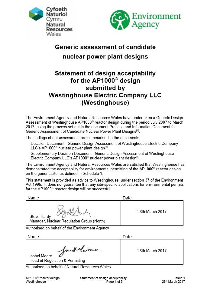 英國(guó)曼徹斯特,2017年3月30日 – 西屋電氣公司今天宣布,其AP1000TM核電站設(shè)計(jì)已順利完成英國(guó)核監(jiān)管機(jī)構(gòu)的審查。該機(jī)構(gòu)結(jié)束了針對(duì)AP1000技術(shù)的通用設(shè)計(jì)評(píng)估(GDA),并向西屋頒發(fā)了設(shè)計(jì)合格性確認(rèn)(DAC)和設(shè)計(jì)的可接受性聲明(SoDA)。DAC和SoDA分別由英國(guó)核管辦公室(ONR)和英國(guó)環(huán)境局(EA)頒發(fā)。