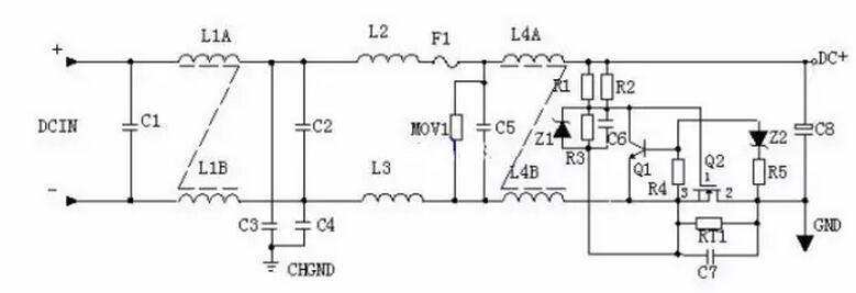 ②R1、R2、R3、Z1、C6、Q1、Z2、R4、R5、Q2、RT1、C7組成抗浪涌電路。在起機(jī)的瞬間,由于C6的存在Q2不導(dǎo)通,電流經(jīng)RT1構(gòu)成回路。當(dāng)C6上的電壓充至Z1的穩(wěn)壓值時Q2導(dǎo)通。如果C8漏電或后級電路短路現(xiàn)象,在起機(jī)的瞬間電流在RT1上產(chǎn)生的壓降增大,Q1導(dǎo)通使Q2沒有柵極電壓不導(dǎo)通,RT1將會在很短的時間燒毀,以保護(hù)后級電路。