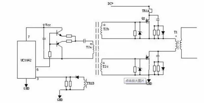 5、有驅(qū)動變壓器的功率變換電路:T2為驅(qū)動變壓器,T1為開關(guān)變壓器,TR1為電流環(huán)。