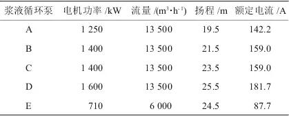 由于該電廠原有脫硫裝置無法滿足新的排放要求,因此進行了超低排放改造。經(jīng)過改造后,每臺機組脫硫系統(tǒng)配置4臺流量為13500m3/h的漿液循環(huán)泵加1臺設計流量為6000m3/h的輔助漿液循環(huán)泵,吸收塔內設置4層噴淋層加2層輔助噴淋層。各漿液循環(huán)泵的設計參數(shù)如表1所示。
