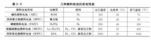 燃料電池是21世紀(jì)各國研究的重點(diǎn),燃料電池和IGCC組合的聯(lián)合循環(huán)代表了當(dāng)今的發(fā)展方向,它的最大優(yōu)點(diǎn)是效率高,CO2排放少。表3-5給出了幾種燃料電池的發(fā)電性能。