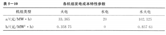 發(fā)電側(cè)共有火電、水電和小火電三個機組,每個機組的發(fā)電成本特性曲線系數(shù)如表5 -10所示。
