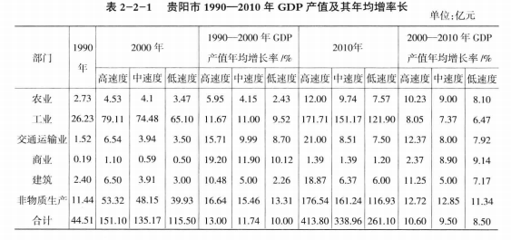 全市社會總產(chǎn)值按1980年可比價格計算,1980-1990年年均增長率達到11.3%。國內(nèi)生產(chǎn)總值1990年達到44.52億元,其中農(nóng)業(yè)2.73億元、工業(yè)26.23億元、交通運輸業(yè)1.52億元、商業(yè)0.19億元、建筑業(yè)2.40億元、非物質(zhì)生產(chǎn)部門11.44億元,分別占其總產(chǎn)值的6.1%、58.92%、3.41%、0.43%、5.39%與25.75%。在未來的經(jīng)濟發(fā)展中,貴陽市將按照發(fā)展社會主義市場經(jīng)濟的要求,進一步深化改革、擴大開放、抓住機遇、加快發(fā)展。按照市政府的規(guī)劃,1990-2000年,國內(nèi)生產(chǎn)總值年遞增率達到11.74%,2000-2010年年遞增率9.5%。到2000年GDP產(chǎn)值將達到135.17億元,2010年達到338.96億元。請見表2-2-1貴陽市1990-2010年GDP產(chǎn)值及其增長率。