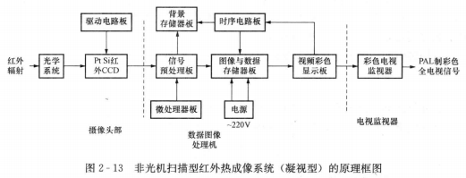 由于超大規(guī)模硅集成電路技術(shù)的迅速發(fā)展,目前已可獲得高均勻響應(yīng)度、高密度的探測器面陣,使非光機掃描型紅外熱成像技術(shù)獲得了極大的進步。圖2-13所示為非光機掃描型紅外熱成像系統(tǒng)(凝視型)原理框圖。