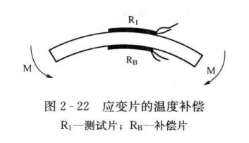 另一種方法是,不用補償件,而是將測試應(yīng)變片和補償應(yīng)變片貼于測試件的不同部位,當測試件變形時,測試片和補償片的電阻將一增一減,這樣既能起到溫度補償作用,又可使電橋輸出電壓增加一倍,提高輸出的靈敏度(見圖2-22)。