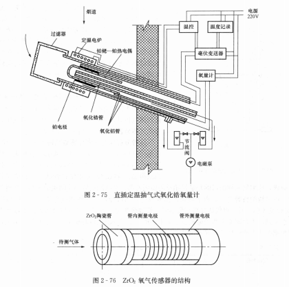 對煙氣中氧含量的測量常采用氧化鋯氧量計和熱磁式氧量計。氧化鋯氧量計的基本原理是,以氧化鋯作為固體電解質(zhì),在高溫下電解質(zhì)兩側(cè)氧濃度不同時將形成濃差電池,而濃差電池產(chǎn)生的電動勢與兩側(cè)氧濃度有關(guān),如一側(cè)氧濃度固定,即可通過測量輸出電動勢來測量另一側(cè)的氧含量。在分析煙氣中的氧含量時,常用空氣作為參比氣體。氧化鋯氧量計測量精確度高,響應(yīng)快,維修工作量小,顯示儀器可以數(shù)字式讀數(shù),也可以模擬式讀教。氧化锫氧量計安裝方式分為抽出式和直插式,后者如圖2-75所示。圖2-76所示為ZrO2氧氣傳感器的結(jié)構(gòu)。