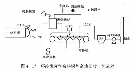 (2)環(huán)冷機廢氣余熱鍋爐。高溫廢氣從環(huán)冷機上部的兩個排氣筒抽出經(jīng)重力除塵器進入余熱鍋爐進行換熱,鍋爐排出的150~200℃的廢氣由循環(huán)風機送回環(huán)冷機風箱連通管循環(huán)使用。系統(tǒng)中專設一臺常溫風機,其作用是當余熱回收設備運行時補充系統(tǒng)漏風。余熱回收設備不運行而燒結生產(chǎn)仍在進行時,可打開余熱回收區(qū)的排氣筒閥門,啟用該風機,以保證環(huán)冷機的正常運行并使它卸出冷燒結礦的溫度低于150℃,其工藝流程如圖4-17所示。