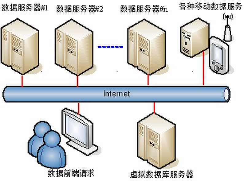 因此,這里主要討論該采用虛擬數(shù)據(jù)庫來實現(xiàn)電力系統(tǒng)廣域范圍內(nèi)的監(jiān)測與控制任務(wù)。整個系統(tǒng)的總體原理如圖 3所示。該系統(tǒng)由通過遠端數(shù)據(jù)服務(wù)器或其他各種接入方式連接進互聯(lián)網(wǎng)(實際運行中一般為電力專網(wǎng))的數(shù)據(jù)服務(wù)組成。該系統(tǒng)需要一個虛擬數(shù)據(jù)庫服務(wù)器。該服務(wù)器處理以下任務(wù):