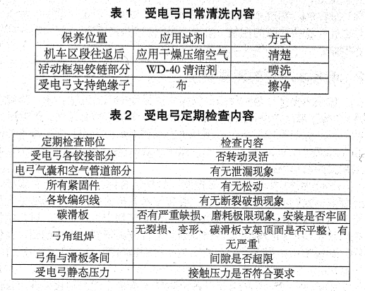 (2)受電弓的日常保養(yǎng)。受電弓的日常保養(yǎng),不僅能夠大大降低受電弓的故障率,而且大大延長了受電弓的使用壽命。因而,受電弓的日常保養(yǎng)成了確保避免受電弓故障的常見措施之一。受電弓日常保養(yǎng)內(nèi)容主要包括清洗和定期檢查兩方面內(nèi)容,其中清洗內(nèi)容和定期檢查內(nèi)容分別詳見如下表1、表2所示。