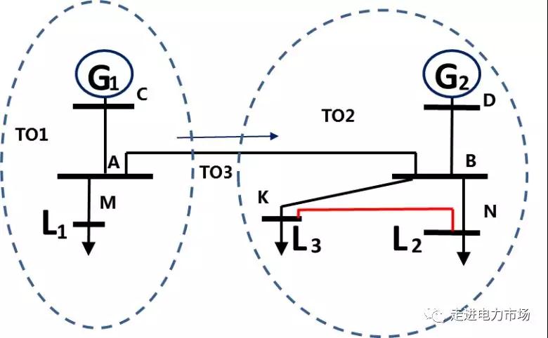 (3)能量市場(chǎng)中,TO2常常是一個(gè)價(jià)區(qū),L2和L3的能量?jī)r(jià)格相同。TO2整體可以參與包括TO1在內(nèi)的更大范圍的能量市場(chǎng),可以從區(qū)外G1購(gòu)電。由于區(qū)外購(gòu)電造成的區(qū)域2購(gòu)電成本的降低由區(qū)內(nèi)所有用戶享受(由于有線路AB,區(qū)域2可以從區(qū)外買一部分低價(jià)電,市場(chǎng)出清電價(jià)降低,區(qū)內(nèi)的所有用戶包括L2和L3都享受到了這個(gè)好處,可以認(rèn)為是支付跨區(qū)線路成本的收益)。