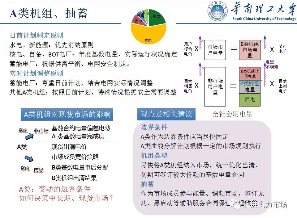 第一個是西電影響市場出清的結(jié)果,第二個是A類機組影響市場。第二個內(nèi)容關(guān)于A類機組和抽水蓄能作為邊界條件如何制定日前計劃?。這里我們沒有給出解決方案?,F(xiàn)在的計劃根據(jù)基數(shù)電量和市場實際狀況決定。A類機組同時影響市場與非市場用戶,同時影響中長期和現(xiàn)貨市場??偨Y(jié)了一下網(wǎng)絡(luò)上大家的觀點和建議,第一個是作為邊界條件,日前計劃應(yīng)該盡快確定,才能幫助B類機組評估競價空間;第二個是A類曲線的分解,可以在一年前確定基本的分解原則;第三個就是A類機組包括哪些類型,可以逐步將A類機組納入市場競爭。抽水蓄能是特別的A類機組,也是非常重要的邊界條件,抽蓄參與市場的運行方式是非常重要的研究內(nèi)容。