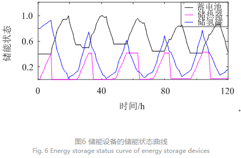 圖6表示了蓄電池、儲熱器和儲氫罐的儲能狀態(tài)曲線,從圖6可以看出3種儲能設(shè)備的運(yùn)用量均較多。對于蓄電池,基本每天都會經(jīng)歷1次完整的充放電循環(huán),總是存儲部分白天的電能來供應(yīng)夜晚