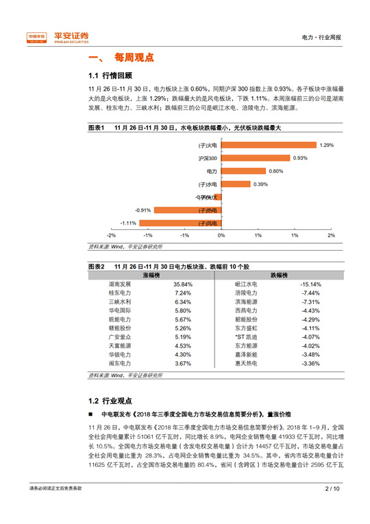 中電聯(lián)發(fā)布《2018年三季度全國電力市場交易信息簡要分析》,量漲價(jià)縮:11月26日,中電聯(lián)發(fā)布《2018年三季度全國電力市場交易信息簡要分析》。全國電力市場交易電量(含發(fā)電權(quán)交易電量)合計(jì)為14457億千瓦時,市場交易電量占全社會用電量比重為28.3%,占電網(wǎng)企業(yè)銷售電量比重為34.5%。與2017年1-9月同期相比,全國市場交易電量增長了約38%,占全社會用電量的比重提高了6個百分點(diǎn)。2018年1-9月,大型發(fā)電集團(tuán)合計(jì)市場交易電量9423億千瓦時(不含發(fā)電權(quán)交易),占大型發(fā)電集團(tuán)上網(wǎng)電量的34.2%。相比上年同期,市場交易電量占大型發(fā)電集團(tuán)上網(wǎng)電量的比重同比增加了4.2個百分點(diǎn)。其中,煤電機(jī)組的市場化率擴(kuò)大了6.8個百分點(diǎn),價(jià)差縮小了2.0分/千瓦時。與今年上半年相比,市場交易電量占大型發(fā)電集團(tuán)上網(wǎng)電量的比重同比增加了2.0個百分點(diǎn);煤電機(jī)組的市場化率擴(kuò)大了3.0個百分點(diǎn),價(jià)差縮小了0.57分/千瓦時;除煤電和水電以外,氣、風(fēng)、光、核機(jī)組的價(jià)差均呈擴(kuò)大化趨勢。