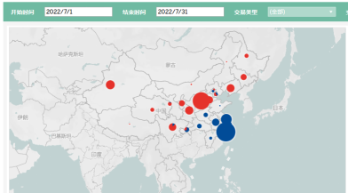 備注:圖中紅色代表售方,藍色代表購方。圓圈大小代表成交電量多少,因交易類型選擇了“全部”,所以成交電量為“日前+日內(nèi)”成交電量。