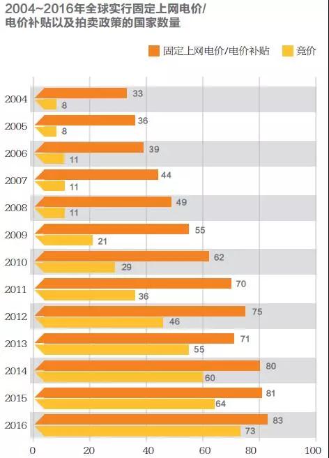在所有的政策類型之中,采用固定電價(或上網(wǎng)電價補(bǔ)貼)與拍賣機(jī)制的國家數(shù)量最多,到2016年分別達(dá)到了83個和73個。