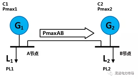 以簡單兩節(jié)點(diǎn)系統(tǒng)為例進(jìn)行說明。系統(tǒng)中具有兩個(gè)節(jié)點(diǎn)A和B,節(jié)點(diǎn)之間有一條線路AB,最大輸電能力是PmaxAB。A節(jié)點(diǎn)接有發(fā)電機(jī)G1和負(fù)荷L1,B節(jié)點(diǎn)接有發(fā)電機(jī)G2和負(fù)荷L2。