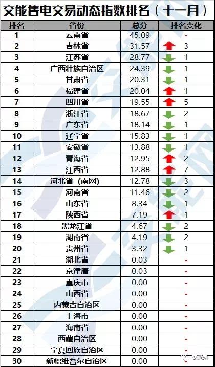 十一月,售電交易動態(tài)指數(shù)新鮮出爐,5分鐘快速把握全國各省電力市場最新交易動態(tài)。過去的一個月,云南省依舊排名第一,吉林省排名向上躥升三位來到榜眼的位置,江蘇省下降一位位居第三。江西省向上攀升了7名,四川省也向上攀升了5名。10月份全國電力市場化電量繼續(xù)超1100億。