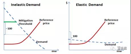 這個(gè)案例中,發(fā)電方是不足以滿足市場(chǎng)需求的。在圖表四中,作者對(duì)比了在兩種情況下提升價(jià)格的能力。左面的圖表描述了剩余需求曲線沒(méi)有彈性的情況。在紐約法下面,價(jià)格是不能高出減緩門(mén)檻值的,也就是不能高過(guò)競(jìng)爭(zhēng)水平100美元,否則報(bào)價(jià)會(huì)被用參考水平價(jià)格取代。但是在加州法下面,發(fā)電廠在爭(zhēng)取最大利潤(rùn)時(shí)候是沒(méi)有限制的,這會(huì)導(dǎo)致在加州方法下,剩余需求曲線沒(méi)有彈性時(shí),報(bào)價(jià)會(huì)遠(yuǎn)高于競(jìng)爭(zhēng)水平。
