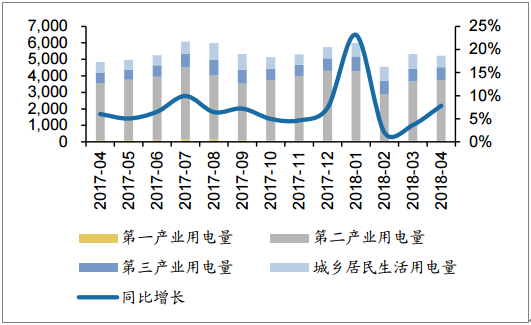 近年來,用電需求增速開始穩(wěn)步提升,根據(jù)國家能源局統(tǒng)計,2017年全社會用電量6.31萬億千瓦時,同比增長6.57%,2018年第一季度用電量為1.59萬億千瓦時,單季度同比增長達9.83%。從最近一年的月度數(shù)據(jù)來看,截至2018年4月,用電量占比最高的第二產(chǎn)業(yè)用電量增速較為平穩(wěn),平均增速為5.46%,第三產(chǎn)業(yè)和居民生活用電則增長速度較高,其中第三產(chǎn)業(yè)平均增速12.90%,居民生活用電平均增速11.22%。
