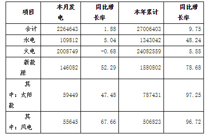 (一)發(fā)電量情況。11月份當月,全省發(fā)電量226.46億千瓦時,同比增長1.88%。其中水電10.98億千瓦時,同比增加5.04%;火電200.87億千瓦時,同比減少0.68%;新能源14.61億千瓦時,同比增長52.29%。
